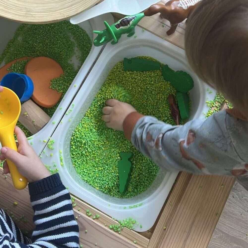 Reis in Wiesenoptik gefärbt, ein paar Dinos, Holz-Bäume und -Steine, verschiedene Schalen und Schaufeln. Die Kinder haben damit fast eine Stunde konzentriert gespiel.